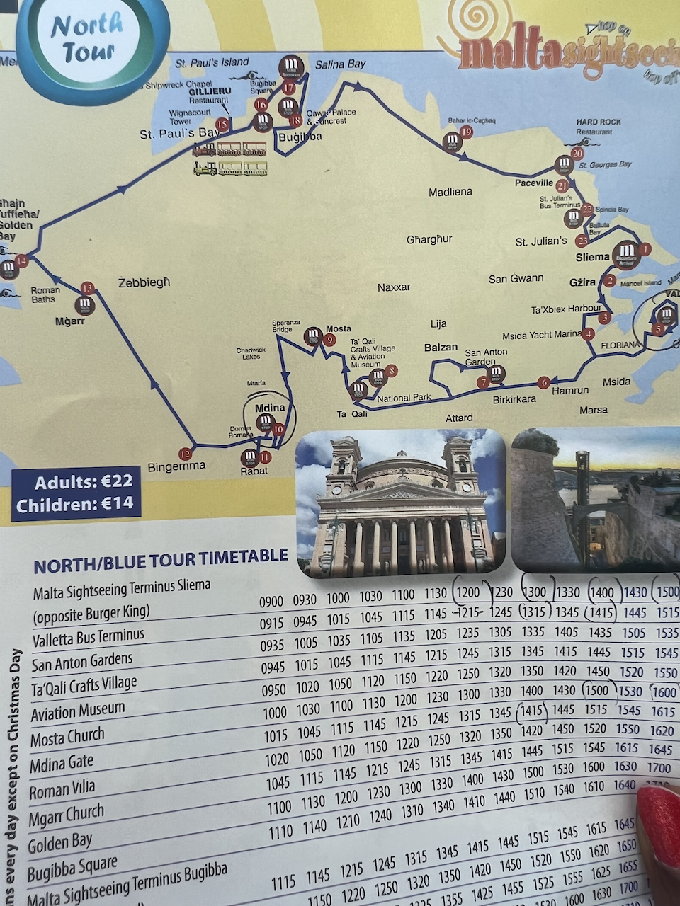 We only had three days planned in Malta, and oh boy did we use it to the fullest! We stayed in the beautiful town of St Julian’s, north of the Capital Valletta. On Day 1, we took the hop-on-hop-off bus that took us around the western and northern part of the island. Although it rained on and off that day, we still were able to visit a few places and sightsee, including cathedrals and historical church buildings that Malta has plenty of. Among them was St Paul’s Cathedral in Mdina (stop #10 on the map below), the “Silent City” that used to be the capital of Malta during the medieval period. The town is a mix of impressive medieval European architectures. Definitely a must see!